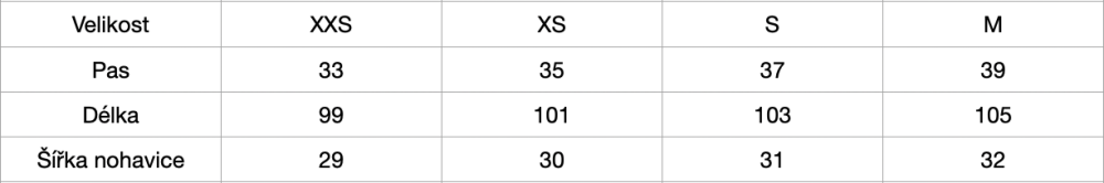 VELIKOSTNÍ TABULKA: